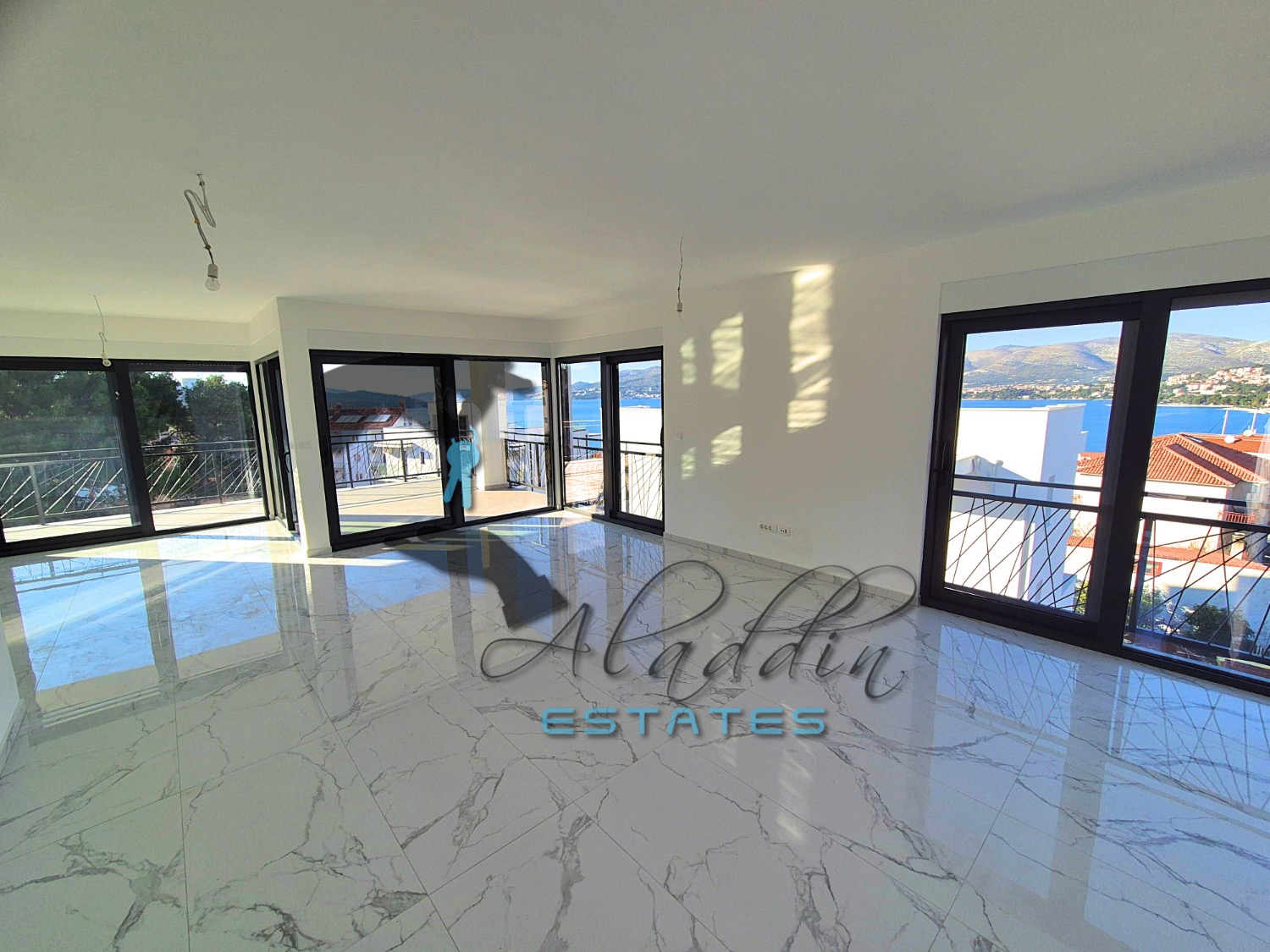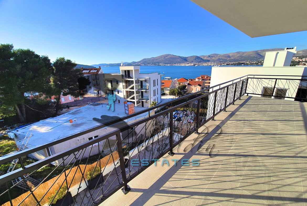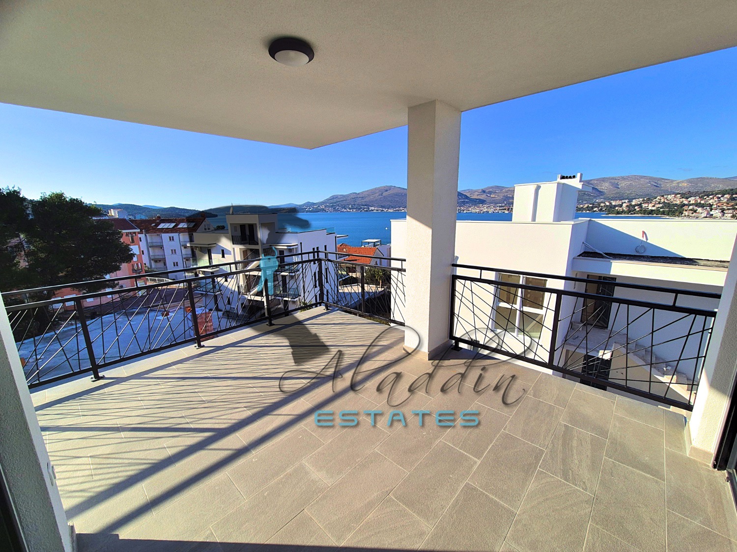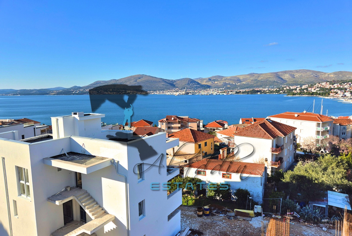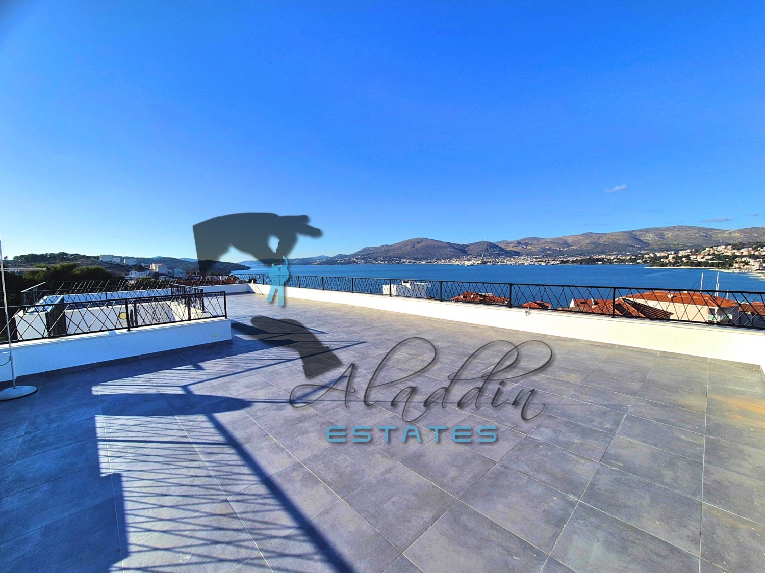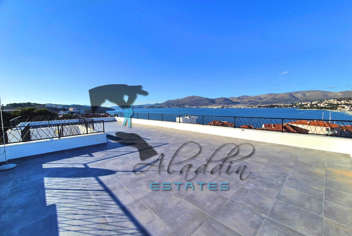 Beautiful newly built penthouse apartment in Okrug Gornji on the island of Čiovo, on the second floor of a residential building, with 161 square meters of net living space, priced at €540,000. It consists of three bedrooms, three bathrooms, hallway, an impressive dining room combined with kitchen and living room and two luxurious covered balconies/terraces with exceptional sea views. The apartment also includes an outdoor parking space and a huge spectacular roof terrace with unbeatable sea view and installations for summer kitchen, jacuzzi and pergola. Apartment in summary: