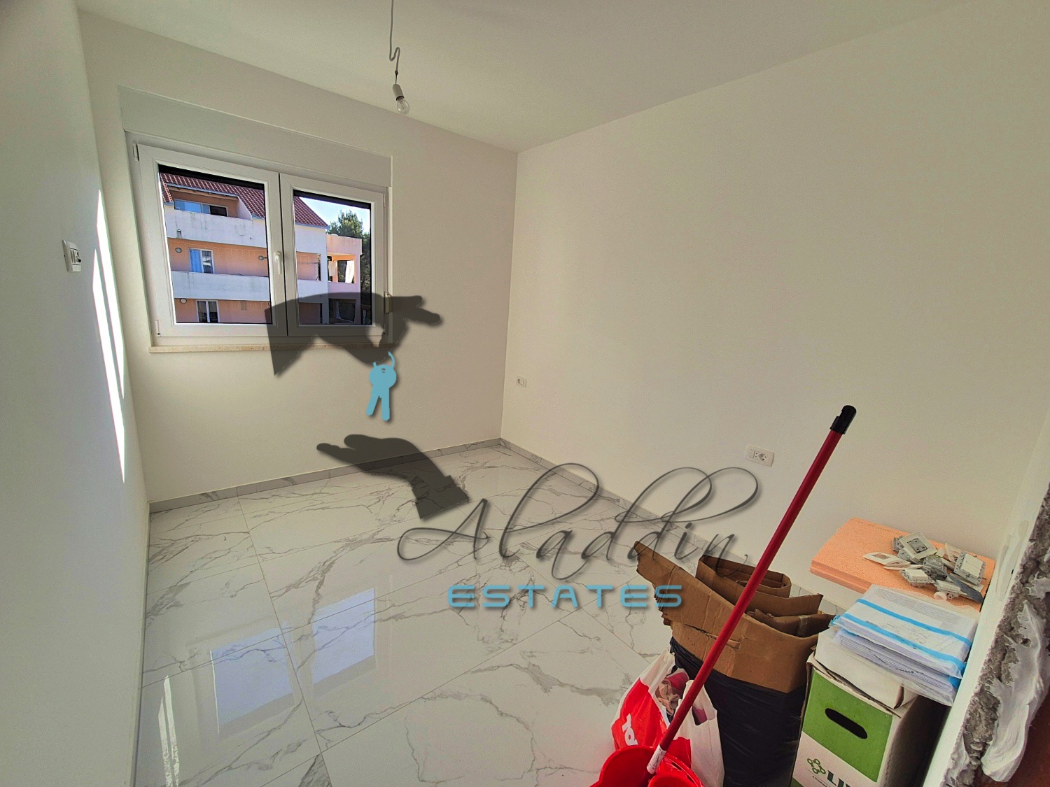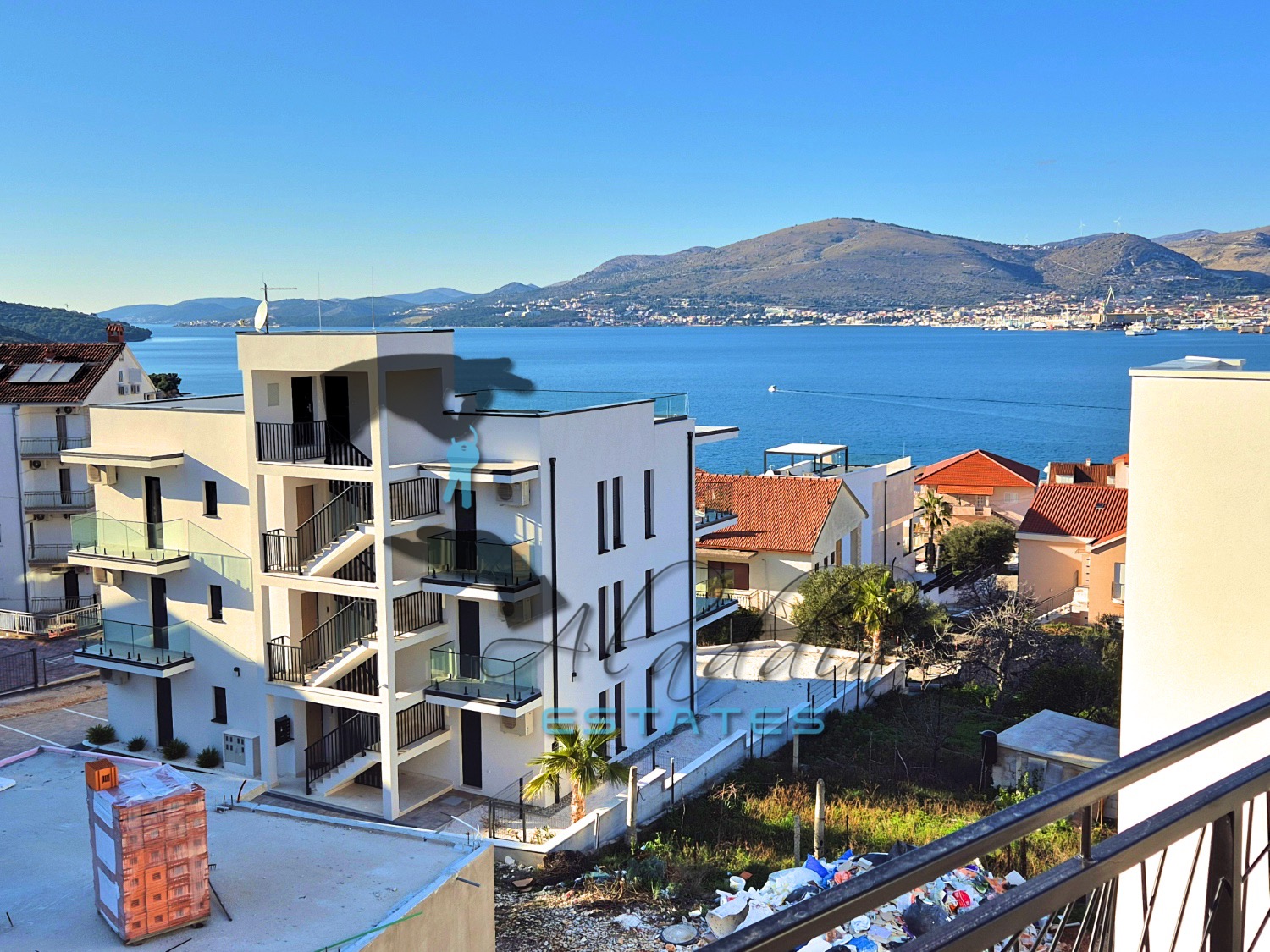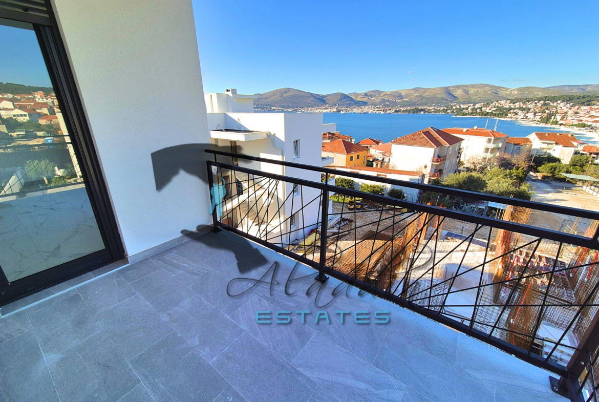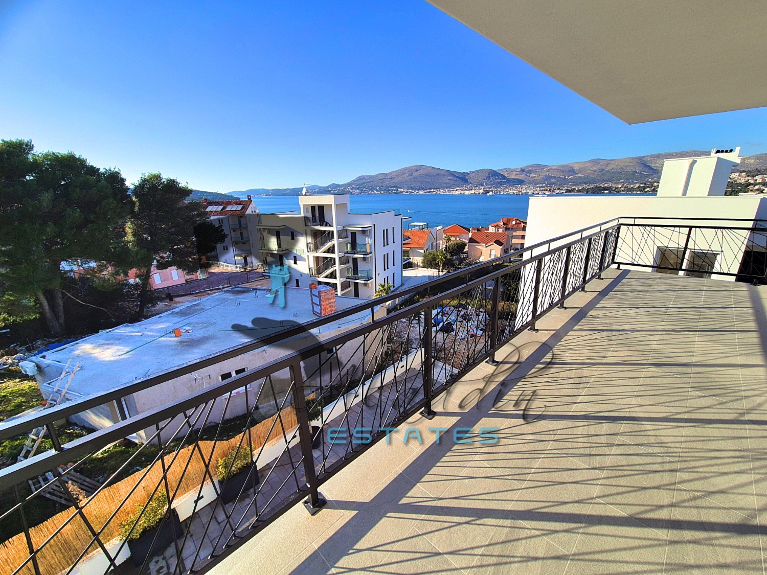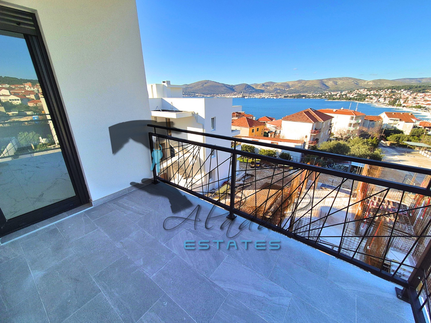 Beautiful newly built penthouse apartment in Okrug Gornji on the island of Čiovo, on the second floor of a residential building, with 161 square meters of net living space, priced at €540,000. It consists of three bedrooms, three bathrooms, hallway, an impressive dining room combined with kitchen and living room and two luxurious covered balconies/terraces with exceptional sea views. The apartment also includes an outdoor parking space and a huge spectacular roof terrace with unbeatable sea view and installations for summer kitchen, jacuzzi and pergola. Apartment in summary: