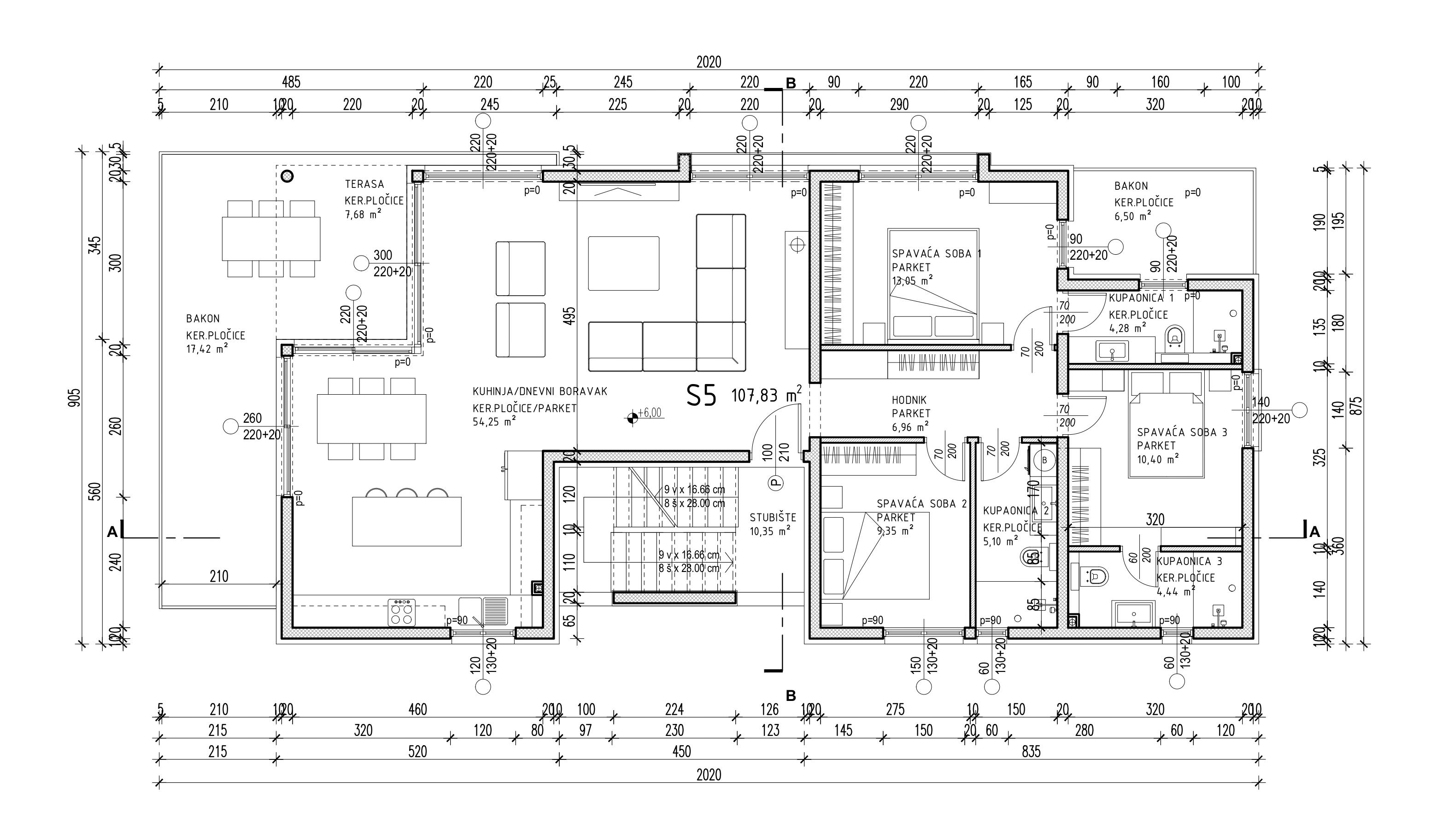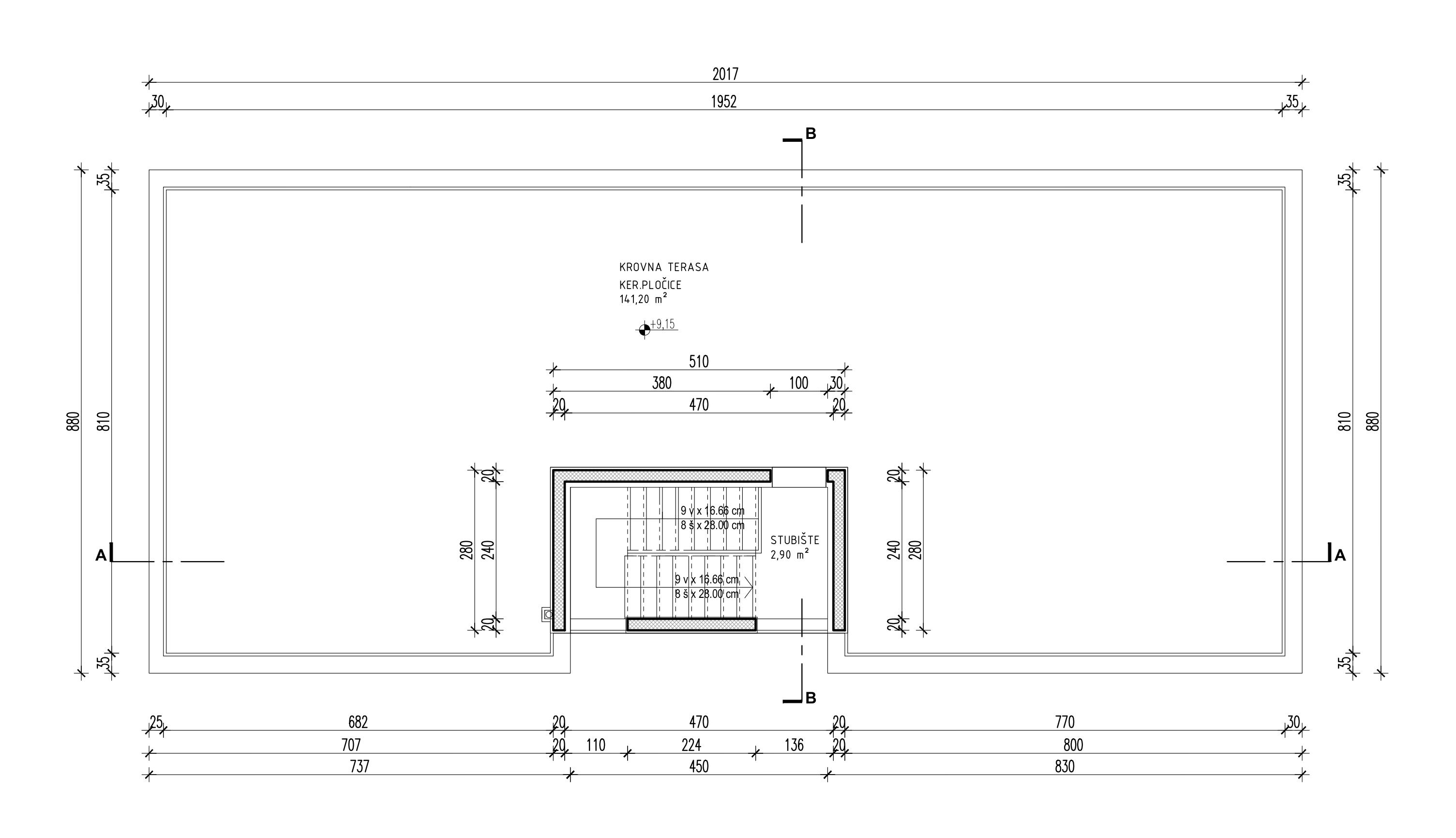 Penthouse apartment: 107.83 m2 interior space, 6.50 m2 and 17.42 m2 covered balconies, 7.68 m2 covered terrace, 12.50 m2 parking space, a full 141.20 m2 roof terrace, for 161.43 m2 of net living space with coefficients, at a price of €540,000.