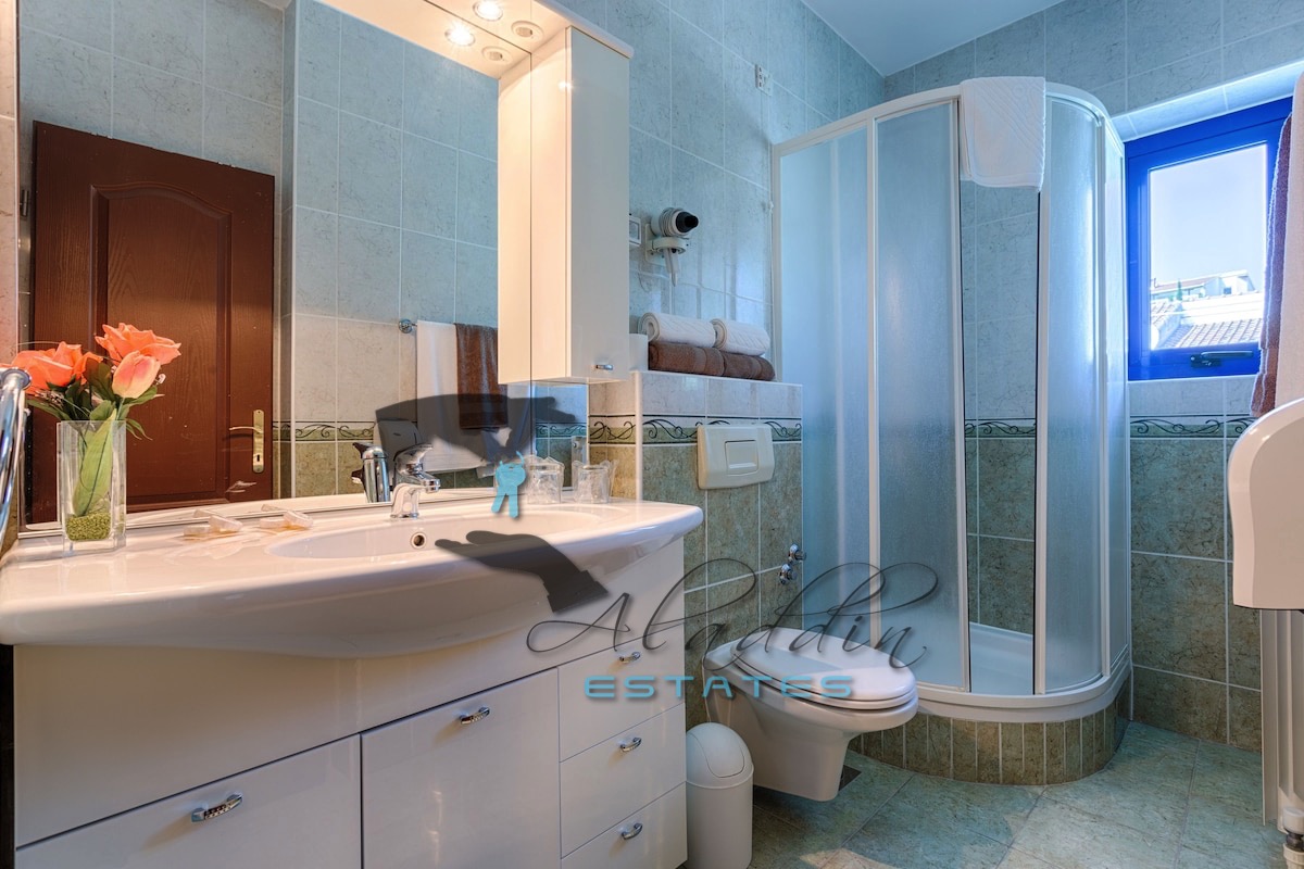 Three-star hotel in Seget Vranjica, in a central position, very close to the beach and featuring beautiful view of the sea and Trogir bay from all levels. It extends over 5 floors with a total living area of 1,144 square meters and land area of 520 square meters. In the partially subterranean floor lies a comfortable garage for 6 vehicles, water tank, fuel tank, engine room, boiler room, utility kitchen, two staff toilets, staircase and access area for delivery vehicle.